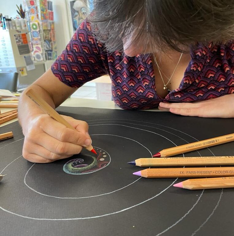 Mijn mandala workshops zijn altijd een combinatie van een thema, het opzetten van mandala, bijpassende kleur en tekentechnieken en het persoonlijke proces.