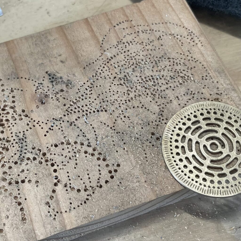 En vanuit dit eerste beeld van 50 bij 50 cm groot ga ik op zoek naar hoe het terug te brengen naar klein, ik teken heel wat af, allerlei vormen en versies, hoe ga ik dit uitzagen, hoe moet vooral die buitenste cirkel. En het moet met de hand, niet een digitaal bestandje ergens naar toesturen. Mijn handen moeten het maken. Creaties kunnen niet anders dan dat het via m’n handen. En zo ontstaat de vorm. Maak ik het eerste ontwerp in messing.
