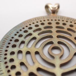 Een paar dagen later, inmiddels ongesteld, ik heb er veel last van, of ben ik misschien wel gewoon niet zo fit? Mijn energie trekt zich compleet naar binnen. Ik kan niet anders dan steeds dieper mijn binnenwereld in. Ik besluit dat mandalabeeld wat ik had maar eens op papier te zetten. En zo begin ik de cirkels te zetten, en vervolgens de eerste lijn, de tweede. En terwijl zo lijn voor lijn het veld begint te ontstaan beginnen de tranen over mijn wangen te stromen. Na enkele lijnen steeds even stoppen omdat dit zo immens veel is om tot me te nemen. Dit veld voelde zoooo groot(s), en dat probeer ik hier op zo’n velletje papier van 50 bij 50 cm te proppen. Eigenlijk wil dit veeel groter, zodat je er in kan lopen, en staan, en al die plekken van voorouders door kunt lopen. En tegelijkertijd hier op papier is het eerste ontwerp, de eerste opzet. En als het heel groot mag worden, dan moet er toch ook een vorm zijn om het tot sieraad te maken zodat je het bij je kan dragen.