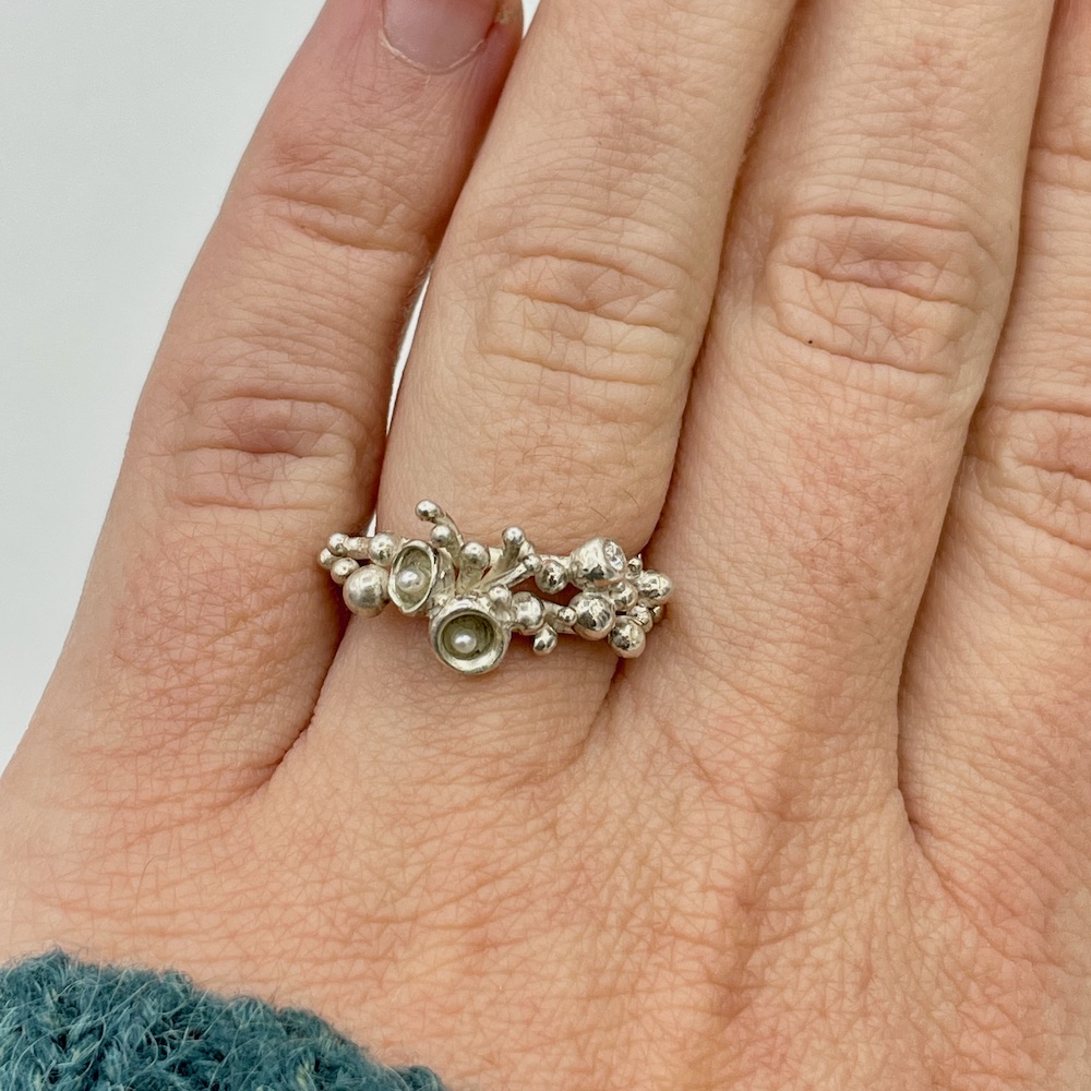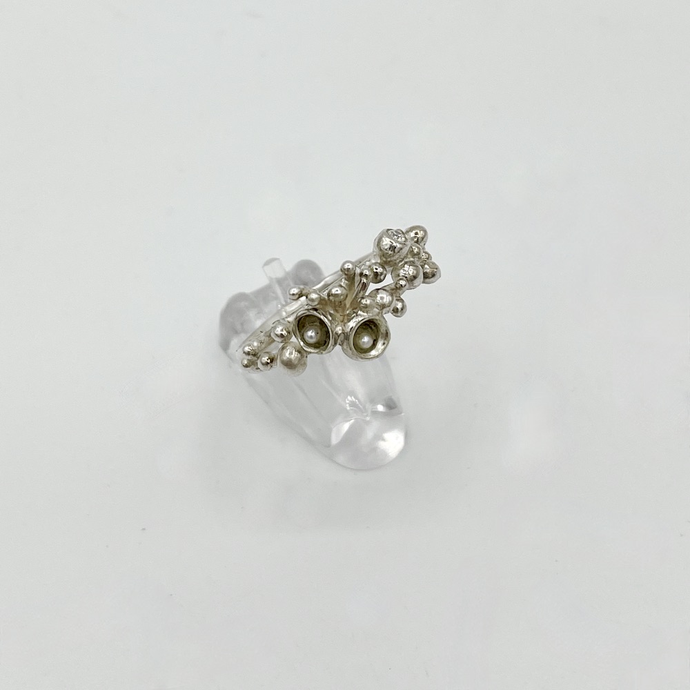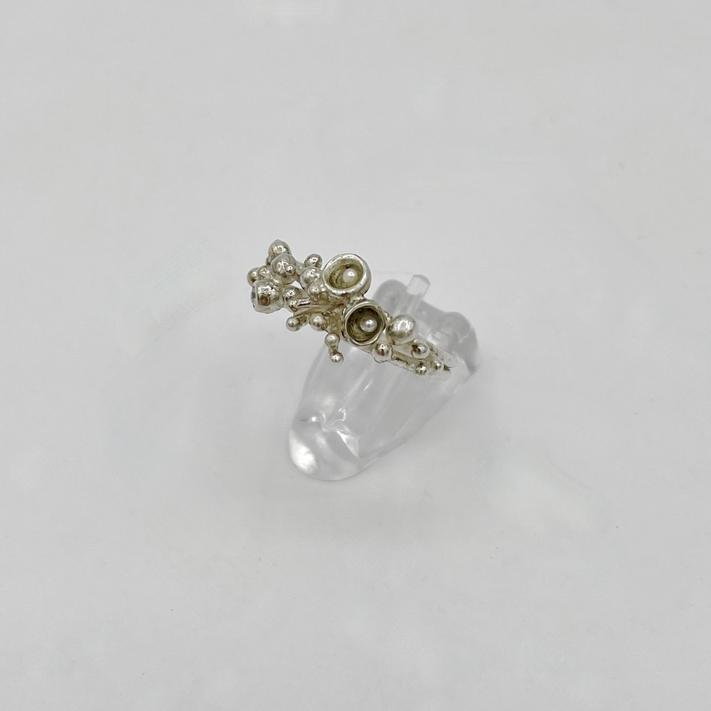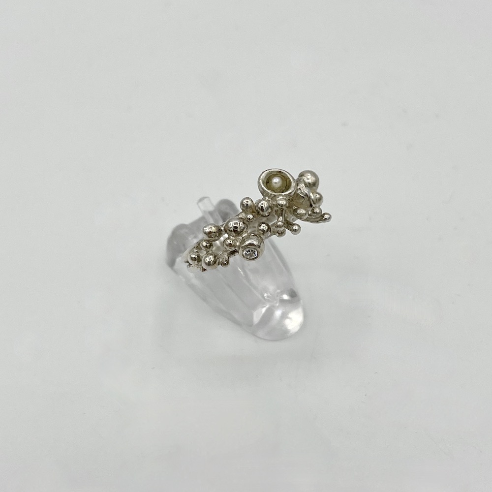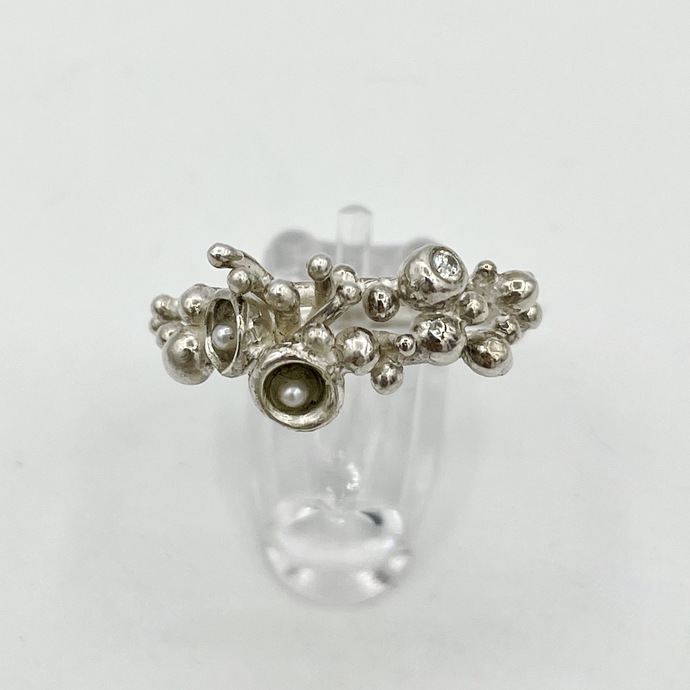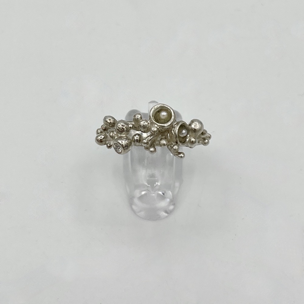 Een prachtige bolletjes ring met daarin twee kleine zoetwaterpareltjes en een zirconia verwerkt. Een eenmalig exemplaar, gemaakt van was en gegoten in zilver.