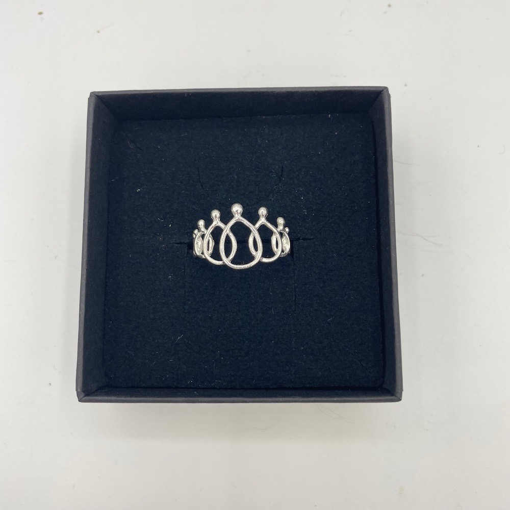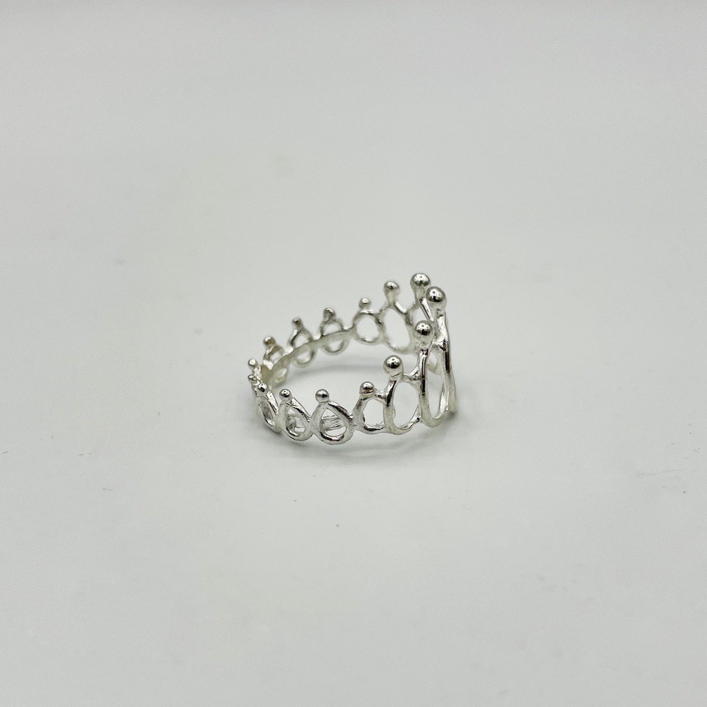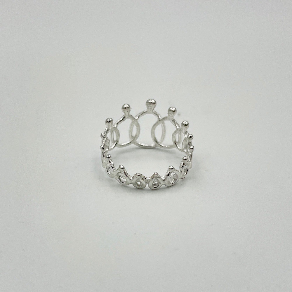 De ring is van 925 zilver, bij de de grotere maten vanaf 18 mm worden er extra poppetjes tussen gezet om de ringmaat te vergroten, daar betaal je 5 euro extra voor.